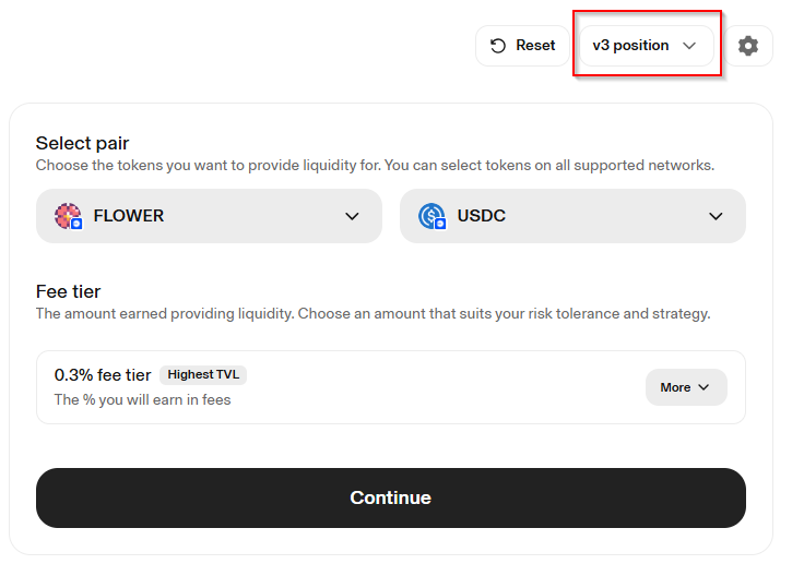 Once you have an equal amount of FLOWER and USDC, use this very fancy link to jump straight to the create position screen. A position is your stake in the pool. The options should be auto-filled for you, but if they are not, ensure that the first token is FLOWER, the second is USDC, and that the position is v3, not any other v. Don't worry about the fee tier, 0.3% is the default and is fine.