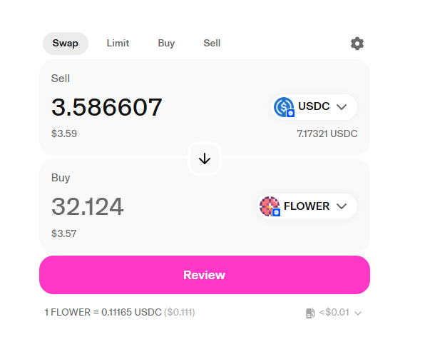 Go to https://app.uniswap.org/buy and get your USDC from your funding source. Make sure it is on the Base network. Use this link to directly swap USDC for FLOWER, and only swap 50%. The value in USD of both tokens will not be exactly the same, but it is close enough.