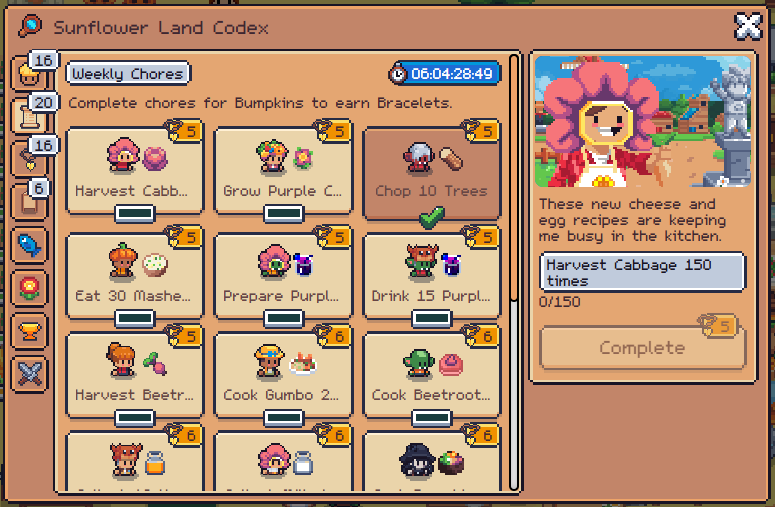 These chores require you to obtain a certain crop, fruit, flower, or other plant resource. Note that the requirement is for a certain number of harvest actions, not the amount of resource that's actually obtained. For example, if the chore is “Harvest Beetroot 40 times," then you must pull up 40 plots worth of Beetroot. Even if you have 20 plots that are boosted to output 2 Beetroot per harvest, you will only complete the chore halfway. Similarly, if you get +1 flower when harvesting a bed, it will not count toward the total for the chore.