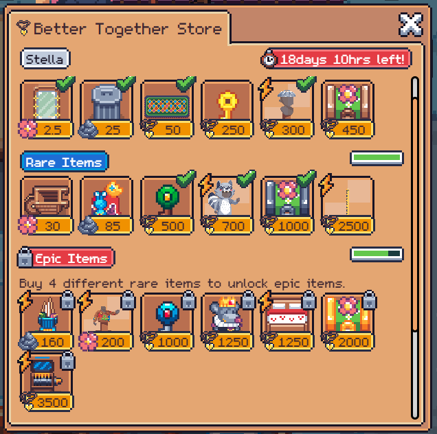 Most items require Tickets to redeem, but a few will cost FLOWER, and others will require you to dig up some of the current Artifact from the Beach Dig Site. The items that require FLOWER will be discounted by 50% if you have an active VIP membership. Some items may have additional costs on top of what's visible in the main menu. For example, the Double Bed offered during Chapter 11 not only required 1250 Bracelets, but also 5000 Wool and 2500 Gems.