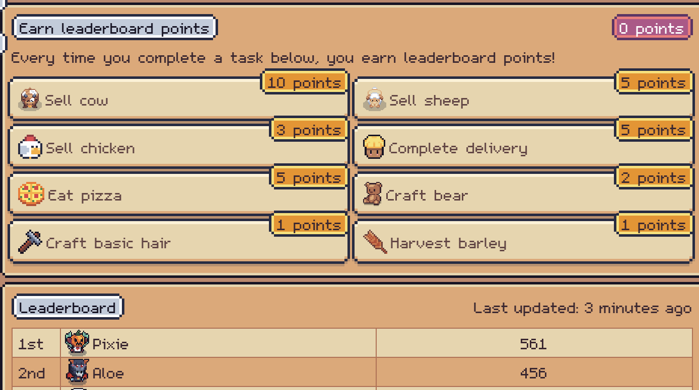 Participants could do any of the below tasks to earn points until the end of the competition window. Based on points earned, players were rewarded with the items (mentioned above) that were designated by Adam at the beginning of the Comp.