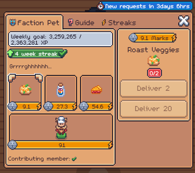 The Faction Pet is the primary mechanic of joining a faction, and will benefit not only you but every participating member of the group. Located centrally in the middle of the faction house, the Pet requires different foods every week. Contribute one of each request to unlock the XP streak bonus!