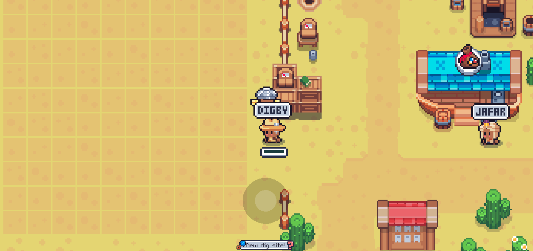 There are two NPCs who manage the Dig Site. Jafar crafts Sand Shovels and Sand Drills at his shop, and buys back any treasures you find for Coins. Digby monitors the site itself, and gives you tips on how to best excavate. Get yourself a tool, then enter the grid to begin digging.