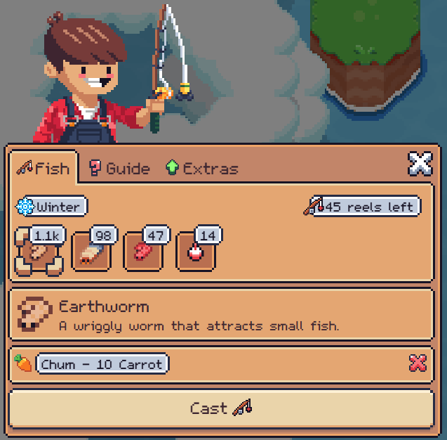 There is a limit on the amount of fishing you can do in a day, shown in the window as “# reels left". This can be increased with the skills Fisherman's 5 Fold (+5), Fisherman's 10 Fold (+10), and More with Less (+15, but -1 worm from all composters). There are also many items and decorations which increase fishing limit, some of which you'll earn just through fishing. If you find yourself completely out of reels, you can buy 5 more for 10 Gems.