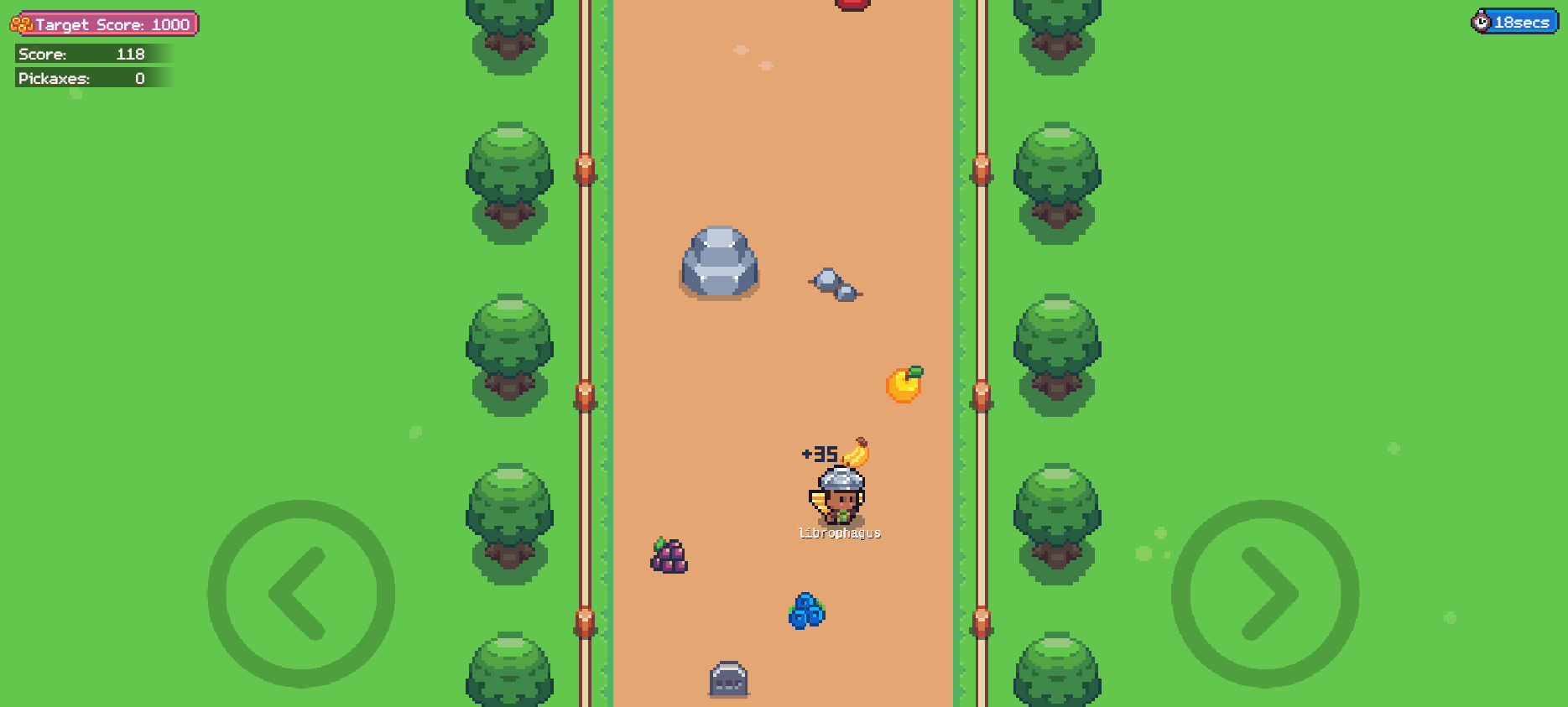 The speed at which you run increases as the game progresses, making it harder to dodge obstacles, but the value of each fruit also increases the faster you go. The first two powerups you will find will be the Magic Mushroom, which elevates your consciousness to the point that you can pass through obstacles completely, while still picking up fruits as you run. The other is the Golden Pickaxe, which can be thrown at an obstacle to remove it from your path.